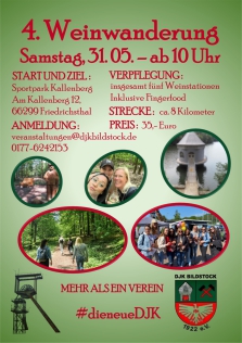 Zwar geht es nicht in die Weinberge, dennoch verbindet die erste Weinwanderung der DJK Bildstock die Kulinarik mit dem Wandern. Auf 7,9 Kilometern wird am Samstag, 31. Mai mit einem Weinglas durch das Naherholungsgebiet Itzenplitz und das Höfertal gewandert.